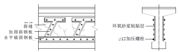 在箱梁、T 梁(或工字梁)梁腹粘結(jié)斜向鋼板可使鋼板與混凝土整體受力,提高主梁的整體剛度與抗剪強(qiáng)度。為防止梁體內(nèi)原有鋼筋或預(yù)應(yīng)力鋼索的銹蝕,粘貼鋼板前應(yīng)先在裂縫處灌入環(huán)氧樹(shù)脂漿液,先封閉裂縫后再貼鋼板, 加固示例見(jiàn)圖7-3-2。