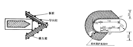 ( 6)板樁墩頭防護。對于土質(zhì)和砂礫石的變遷性河段,可采用板樁進行墩頭防護,見圖10-3-4。板樁頂面一般不應高出河床面,最好埋置在沖刷線以下,因板柱高出床面,會產(chǎn)生阻水,在板樁前造成局部沖刷,影響護樁安全。板樁尖頭做成單向斜口式,打樁時可使板樁接縫緊密,板樁入土嵌制深度一般為0.5~1.0m。