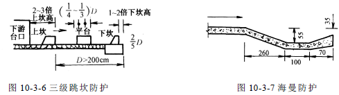 ( 10) 三級跳坎防護。當下游沖刷嚴重,為緩沖水流沖刷影響,可用漿砌塊、片石或預制混凝土塊筑成三級消力坎(或稱三級跳坎),見圖10-3-6。