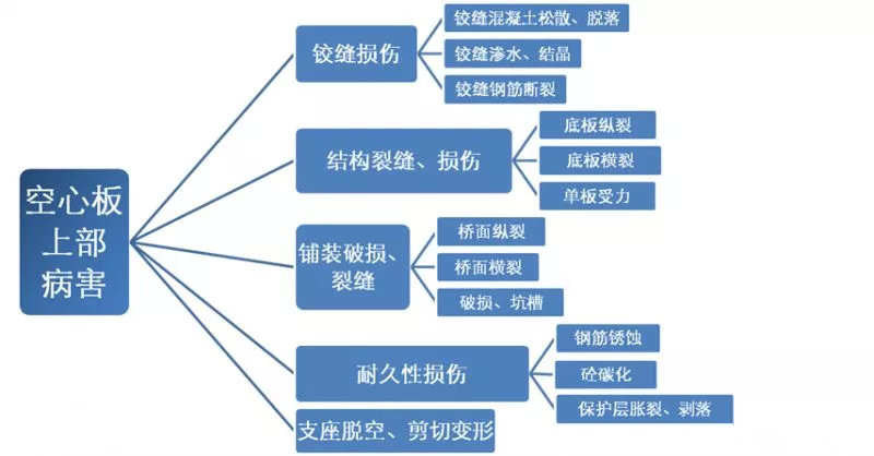 空心板梁的病害不是獨(dú)立的,而是相互影響、相互制約的。譬如最常見(jiàn)的病害支座脫空危害較大,支座脫空勢(shì)必造成其他支座反力增大,超過(guò)支座承載能力,易引起支座本身的損壞;支座脫空會(huì)大大增加板梁橫向彎矩,易引起板梁板底縱裂;支座脫空對(duì)鉸縫的工作狀況會(huì)產(chǎn)生不利影響,會(huì)加劇鉸縫損壞,進(jìn)而會(huì)形成單板受力,最終造成對(duì)板梁本身的損傷。