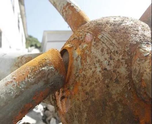 桿件上部存在積灰腐蝕。積灰腐蝕是大氣腐蝕的一種,隨著環(huán)境的不同,大氣中的塵埃也具有不同的性質(zhì),主要表現(xiàn)在其溶解性和腐蝕性上。當(dāng)塵埃落于鋼結(jié)構(gòu)表面時(shí),塵埃與鋼結(jié)構(gòu)之間的縫隙有利于水分的凝結(jié)。另外,有些無(wú)腐蝕性的塵??梢晕礁g性物質(zhì),當(dāng)其溶于水膜時(shí)便帶入了腐蝕性物質(zhì)。有腐蝕性的塵埃溶于水膜后會(huì)參與腐蝕反應(yīng)。尤其值得我們注意的是,當(dāng)鋼結(jié)構(gòu)局部落有塵埃時(shí),很有可能出現(xiàn)局部腐蝕,在局部區(qū)域出現(xiàn)應(yīng)力集中[1]。