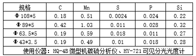 為了全面深入分析網(wǎng)架坍塌原因,從網(wǎng)架鋼材的化學(xué)成分、力學(xué)性能和網(wǎng)架構(gòu)件承載力三個(gè)方面進(jìn)行了試驗(yàn)分析。本次取樣分析的鋼管類型和分析結(jié)果見(jiàn)表2。