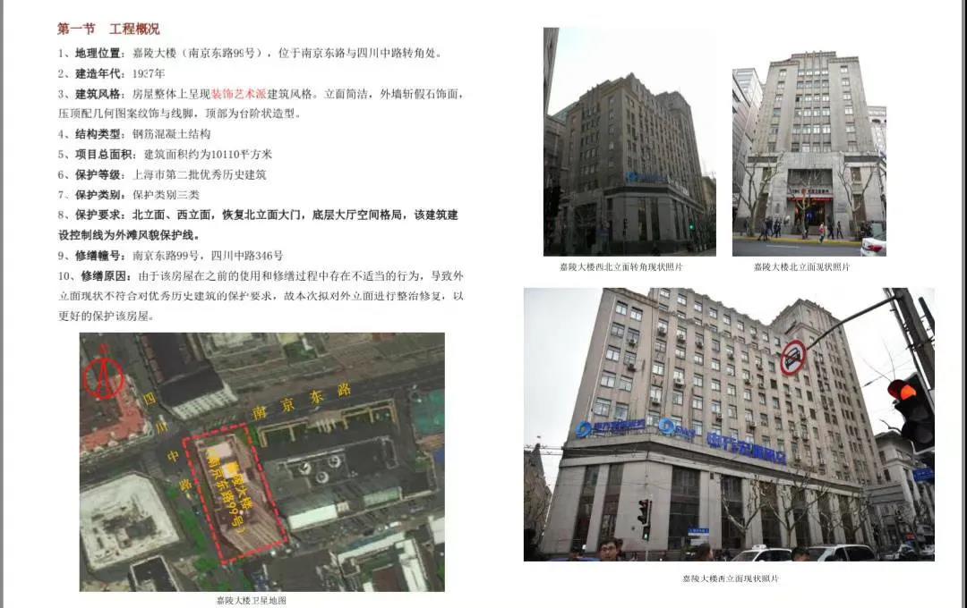 嘉陵大樓由大地產(chǎn)商、猶太人哈同所建,用他妻子中國(guó)女子羅迦陵的名字命名(后改為“嘉陵”)。大樓占地1084平方米,由英商德和洋行與世界實(shí)業(yè)公司聯(lián)合設(shè)計(jì),華商新申?duì)I造廠承包打樁工程,陶桂記營(yíng)造廠承建,建筑面積10110平方米,1937年12月竣工。大樓北低南高,分別為8層、10層和13層,鋼筋混凝土結(jié)構(gòu)。建筑造型與文藝復(fù)興風(fēng)格的建筑大相徑庭,沒(méi)有繁復(fù)的裝飾和線(xiàn)條,顯示了近代建筑簡(jiǎn)潔明朗的風(fēng)格。建筑立面是水泥鏨假石和鋼窗,底層勒腳采用金山石。內(nèi)部水暖、消防設(shè)施齊全,用桃木做護(hù)壁,柳安木做地板。目前,嘉陵大樓位于外灘歷史文化風(fēng)貌區(qū)內(nèi),系第二批市優(yōu)秀歷史建筑,保護(hù)類(lèi)別為三類(lèi)。
