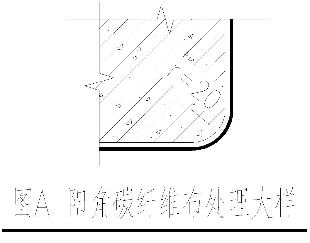 3、梁轉(zhuǎn)角粘貼碳纖維布時,應(yīng)進(jìn)行倒角處理,將角部打磨成圓弧狀,詳圖A.