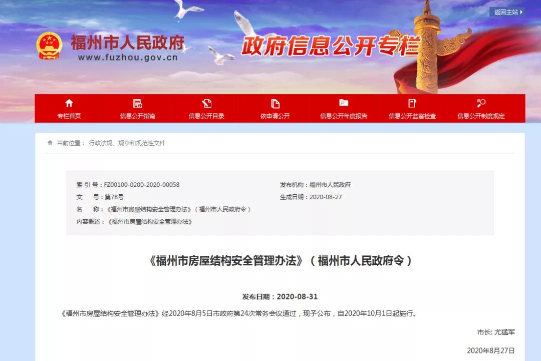 8月31日,福州市人民政府網發(fā)布《福州市房屋結構安全管理辦法》(以下簡稱《辦法》)?!掇k法》經市政府第24次常務會議通過,10月1日起施行。